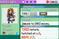 The Yumeko was hatched randomly while I was breeding them, and the Shiny Nazrin came from the Japanese version of Touhoumon 1.8.